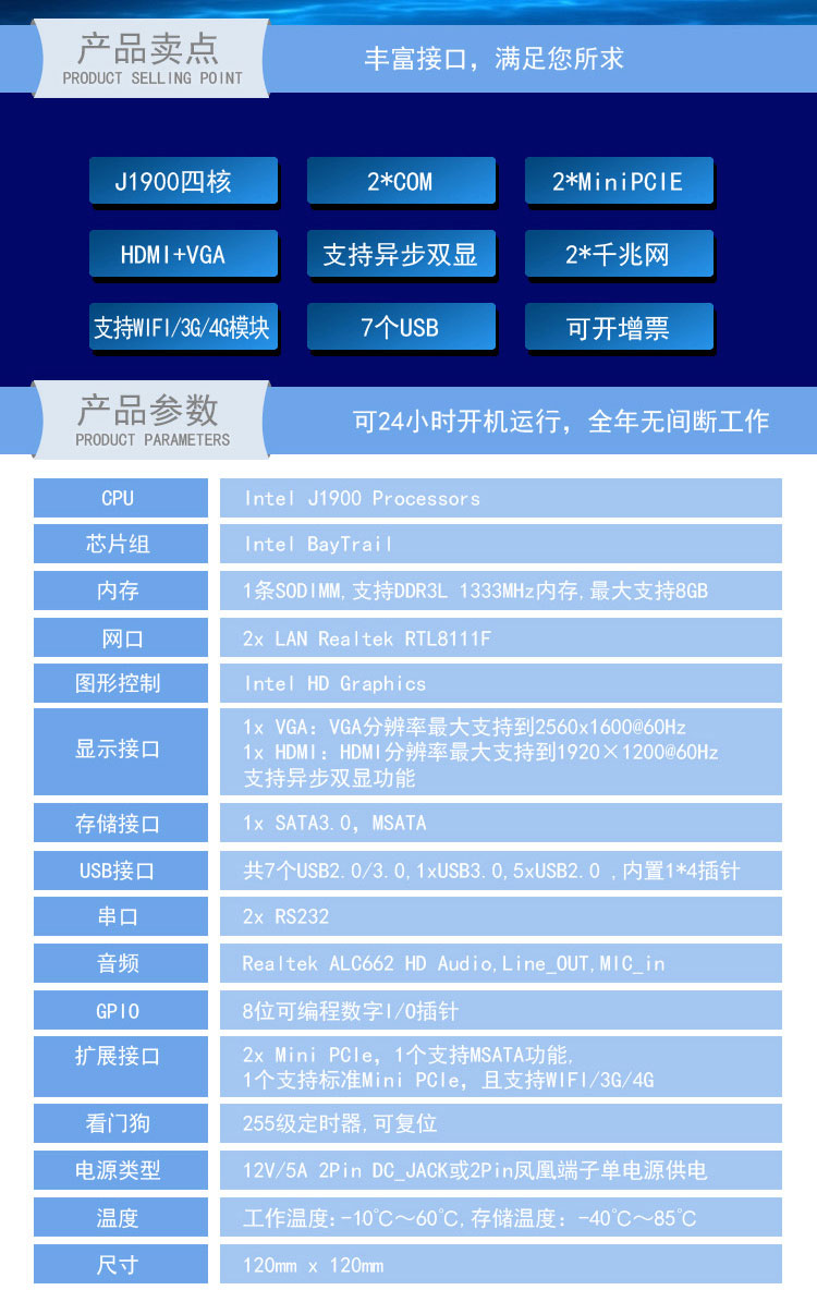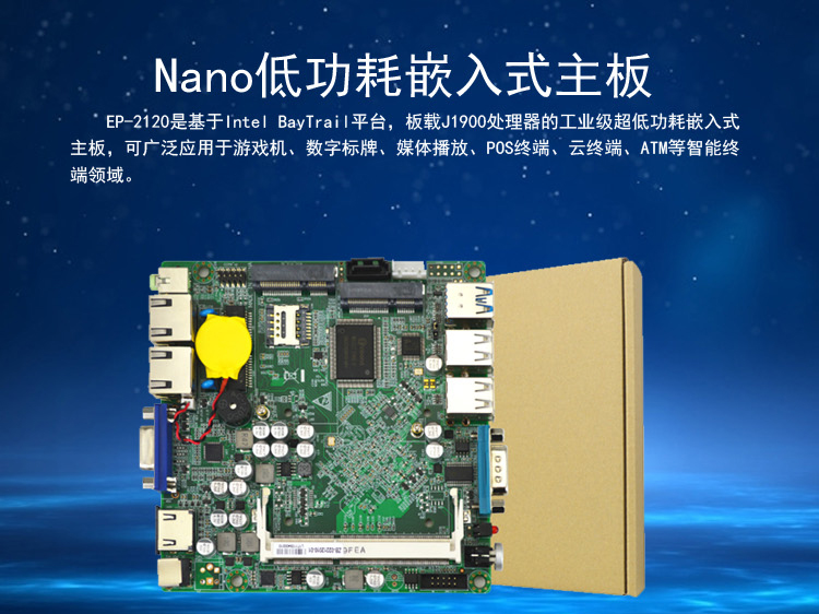 产品型号:EP-2120 产品规格:尺寸:120mm x 120mm 产品特性 Intel J1900四核CPU,最大支持8G,双网,支持异步双显功能,2x RS232,7x USB。2x Mini PCIe 应用范围 可广泛应用于游戏机、数字标牌、媒体播放、POS终端、云终端、ATM等智能终端领域。