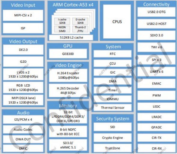 全志科技(Allwinner) A133(ARM Cortex-A53)四核64位超强SoC,搭载Android/Linux系统,主频高达1.6GHz。采用GE8300 GPU,支持OpenGL ES 1.1/2.0/3.2,Vulkan1.1,OpenCL 1.2,支持H265/H264 4K 30fps 解码,VC-1、MPEG-1/2/4、VP8/9 等多格式1080P 60fps 视频解码,H264 1080P@60fps 编码。丰富的外部接口支持,A133 SoC 内部组成: